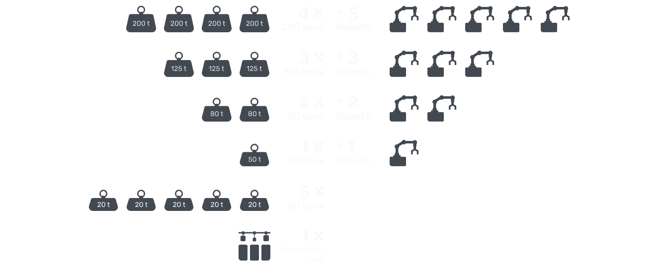With 4 units of 200 t, 3 of 125 t, 2 of 80 t, 1 of 50 t and 5 of 20 t, all connected to a total of 11 anthropomorphic robots, plus 1 passivation line we offer maximum flexibility and quality to meet any production requirement.