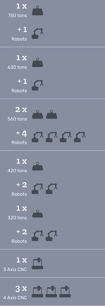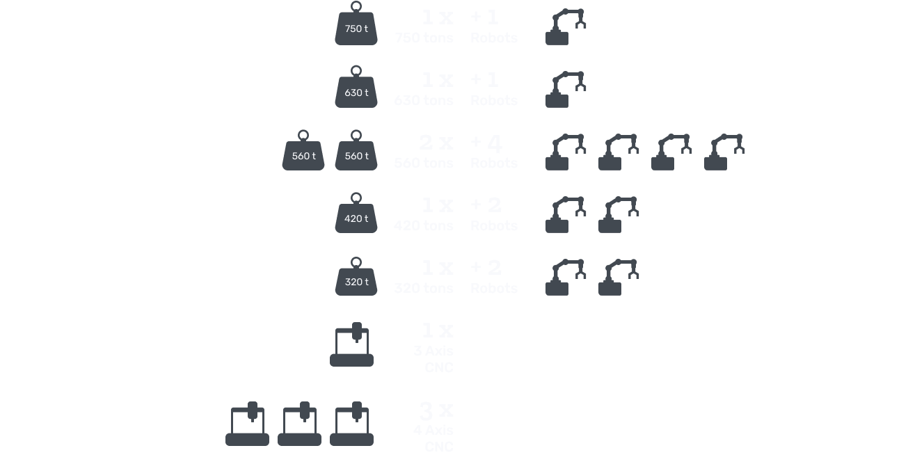 With 1 units of 750 t, 1 of 630 t, 2 of 560 t, 1 of 420 t and 1 of 320 t, all connected to a total of 10 anthropomorphic robots, plus 1 3 Axis CNC and 3 4 Axis CNC, we offer maximum flexibility and quality to meet any production requirement.